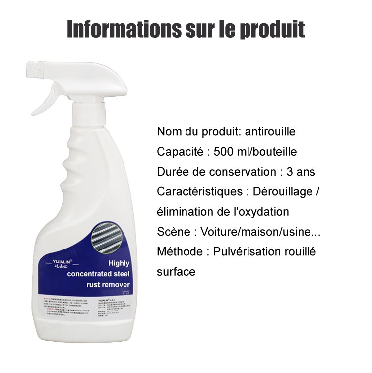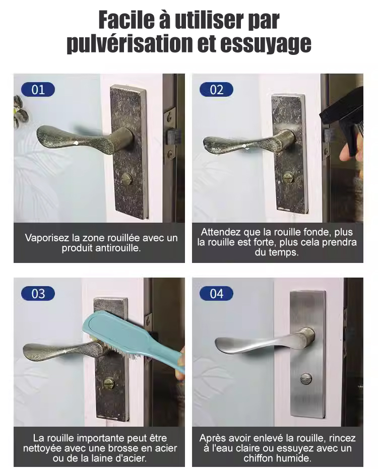 Ce protecteur anti-rouille ultra-puissant ne se contente pas d'éliminer la rouille: il supprime aussi les taches et redonne au métal tout son éclat d'origine! Une simple pulvérisation suffit pour que la rouille se détache d'elle-même, le tout sans abîmer le métal ni vos mains!