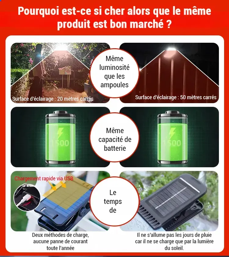 Peut être placé n'importe où, illumine instantanément votre espace. Sans électricité, sans câbles, 0 € de facture toute l'année, garantie de 10 ans.